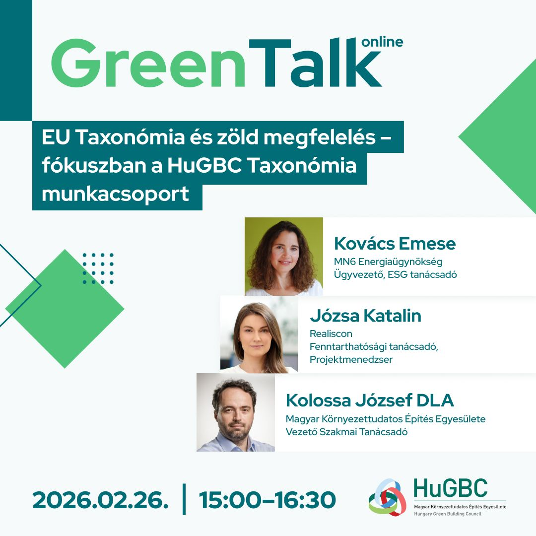 Cégünk vezetője, Kovács Emese, a HuGBC Taxonómia munkacsoport szakértőjeként előadója a Green Talk webinárium idei első eseményének.
